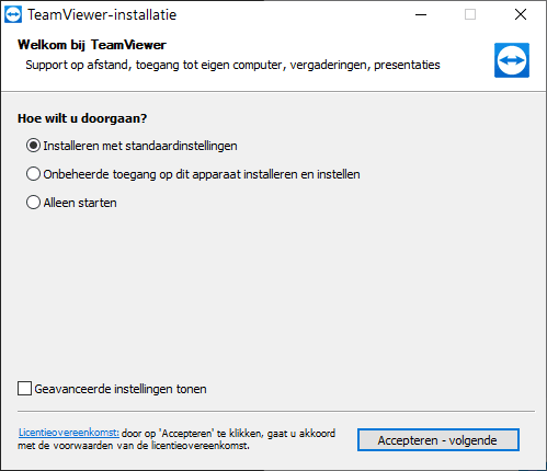 U kunt Teamviewer eventueel ook alleen starten zonder te installeren. Kies dan voor 'Alleen starten'.