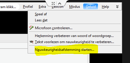 Het bijwerken van het profiel gaat via het Dragon menu, bovenin het scherm. Ga naar 'Geluid' en dan 'Nauwkeurigheidsafstemming starten'.